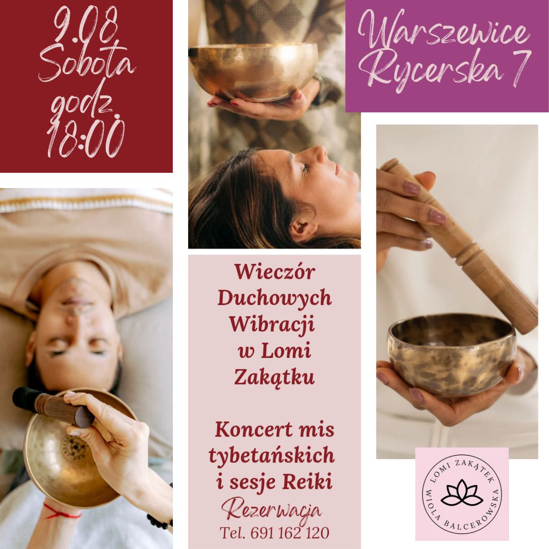 Warszewice/k. Chełmży ul. Rycerska 7, WarszewiceKoncert mis tybetańskich & sesje Reiki 9 sierpnia (sobota) Godzina: 18:00 Lomi Zakątek – Warszewice, ul. Rycerska 7 Zatrzymaj się na chwilę…Pozwól dźwiękom mis tybetańskich przeniknąć Twoje wnętrze,otul się subtelną energią Reiki,odpręż ciało i ukołysz duszę. Koncert mis tybetańskich – 50 zł Indywidualna sesja Reiki (dla chętnych) – 100 zł Ilość miejsc ograniczona Zapisy i kontakt: 691 162 120 przez Messenger